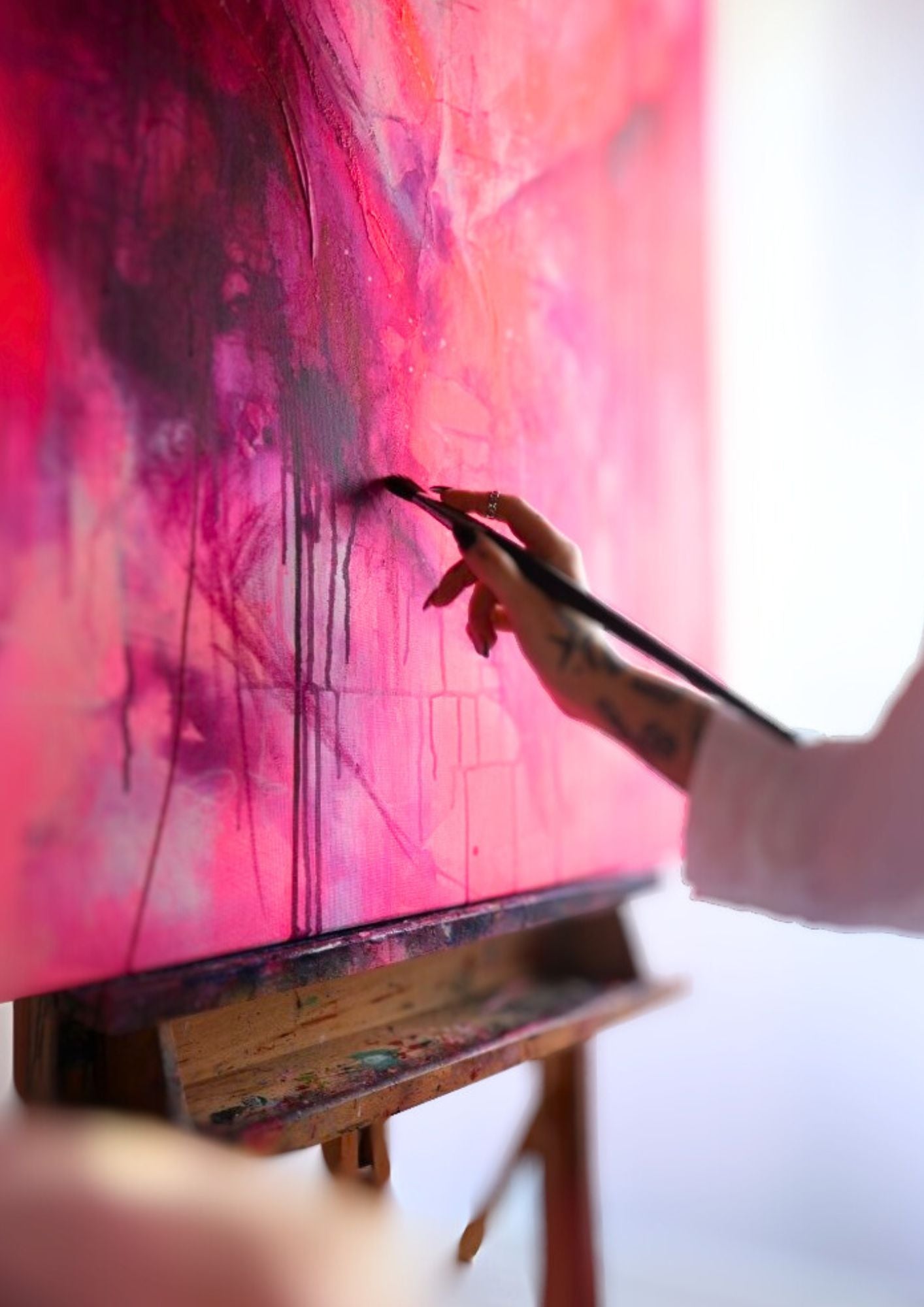 Jag arbetar med starka färger i kontrast med gråskalans stillhet, för att fånga känslor, identitet och inre liv. Det är i mötet mellan det feminina och det vilda, det färgstarka och det mörka, som min konst tar form.